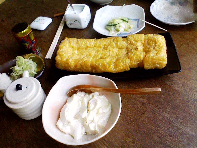 大判の揚げたての わらじ揚げと おぼろ豆腐 大盛りのお蕎麦のセット♪